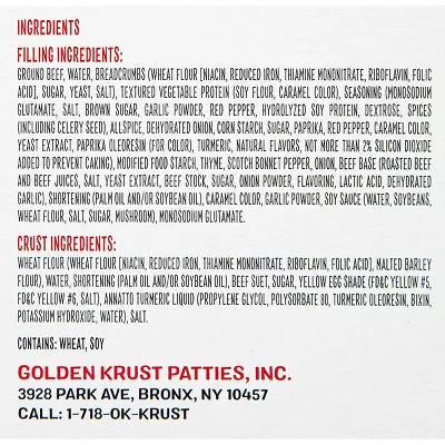 Ingredients: filling ingredients: ground beef, water, breadcrumbs (wheat flour [niacin, reduced iron, thiamine mononitrate, riboflavin, folic acid], sugar, yeast, salt), textured vegetable protein (soy flour, caramel color), seasoning (monosodium glutamate, salt, brown sugar, garlic powder, red pepper, hydrolyzed soy protein, dextrose, spices {including celery seed), allspice, dehydrated onion, corn starch, sugar, paprika, red pepper, caramel color, yeast extract, paprika oleoresin for color), turmeric, natural flavors, not more than 2% silicon dioxide added to prevent caking), modified food starch, thyme, scotch bonnet pepper, onion, beef base (roasted beef and beef juices, salt, yeast extract, beef stock, sugar, onion powder, flavoring, lactic acid, dehydrated garlic), shortening (palm oil and/or soybean oil), caramel color, garlic powder, soy sauce (water, soybeans, wheat flour, salt, sugar, mushroom), monosodium glutamate. crust ingredients: wheat flour (wheat flour [niacin, reduced iron, thiamine mononitrate, riboflavin, folic acid], malted barley flour), water, shortening (palm oil and/or soybean oil), beef suet, sugar, yellow egg shade (fd&c yellow #5, fd&c yellow #6, salt), annatto turmeric liquid (propylene glycol, polysorbate 80, turmeric oleoresin, bixin, potassium hydroxide, water), salt.