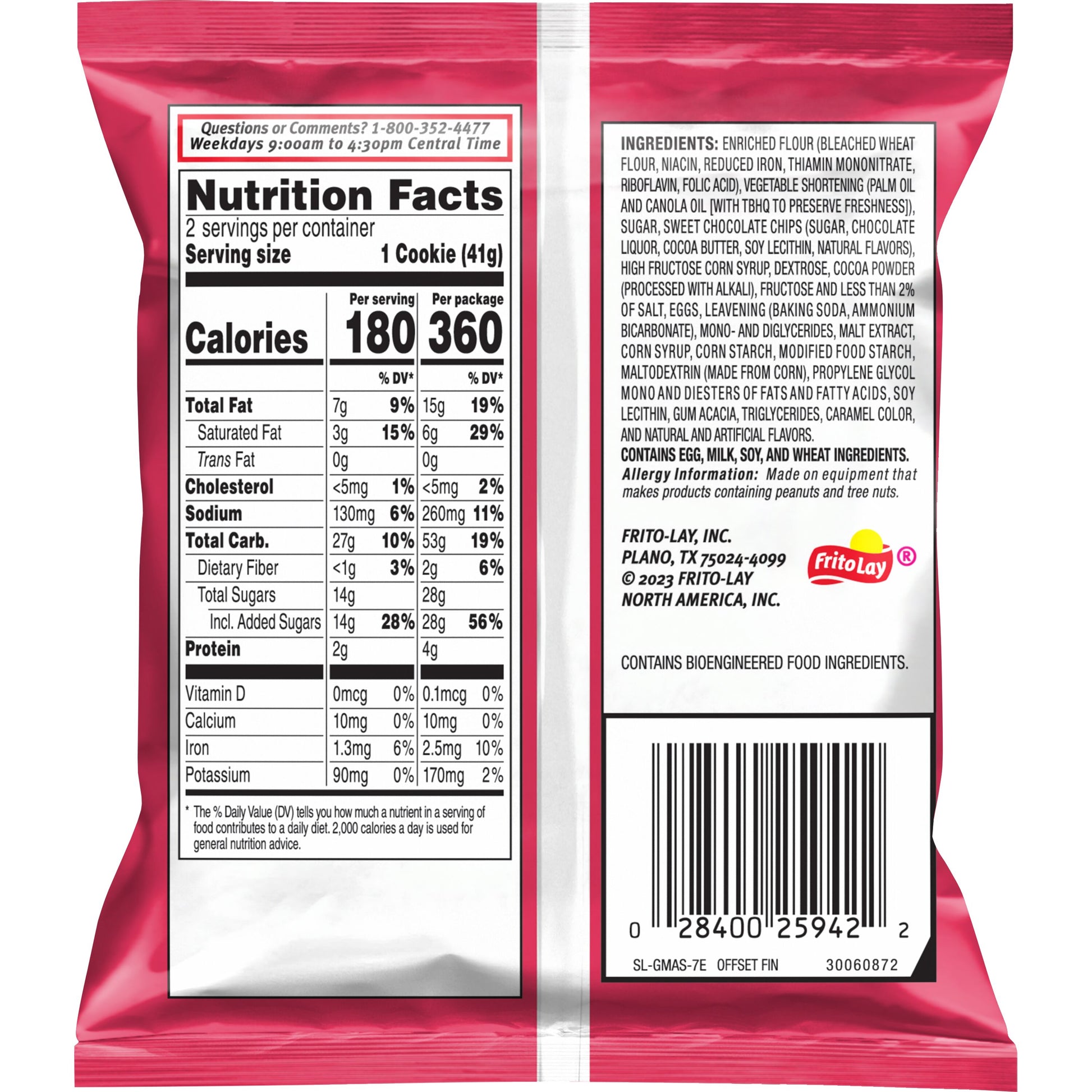 Ingredients: Enriched Flour (Unbleached and Bleached Wheat Flour, Niacin, Reduced Iron, Thiamin Mononitrate, Riboflavin, Folic Acid), Vegetable Shortening (Palm Oil, Canola Oil, TBHQ and Citric Acid [to Preserve Freshness]), Sugar, High Fructose Corn Syrup, Semi-Sweet Chocolate Chips (Sugar, Chocolate Liquor, Cocoa Butter, Dextrose, Milk Fat, Soy Lecithin, Natural and Artificial Flavors), Dextrose, Cocoa Powder (Processed with Alkali), Fructose, and Less than 2% of the Following: Malt Syrup, Modified Corn Starch, Caramel Color, Salt, Eggs, Leavening (Baking Soda, Ammonium Bicarbonate), Propylene Glycol Monoesters of Fats and Fatty Acids, Mono- and Diglycerides, Soy Lecithin, BHT (to Protect Flavor), Citric Acid, Natural and Artificial Flavors (Including Natural Powdered Swiss Chocolate Flavor), Skim Milk, Maltodextrin (Made From Corn), Gum Acacia, Triglycerides, and Wheat Flour.