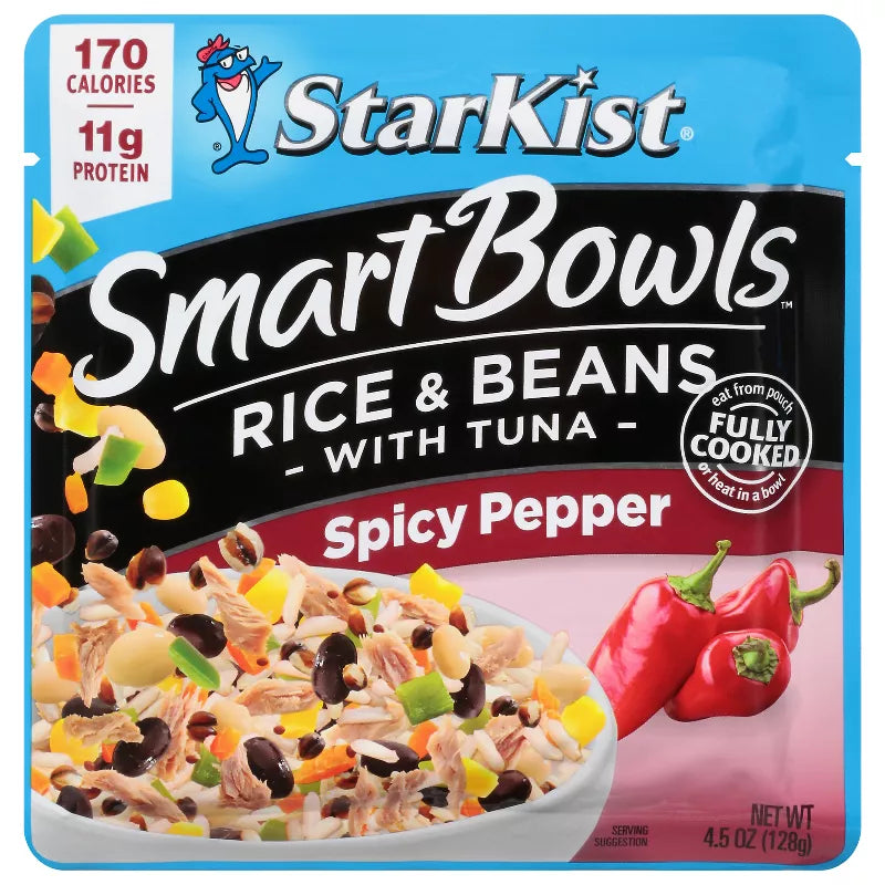 Enjoy a fiesta of flavor with Starkist Smart Bowls Spicy Pepper, featuring a savory blend of brown rice, black beans, hot sauce, wild caught light tuna, and a hint of lime.